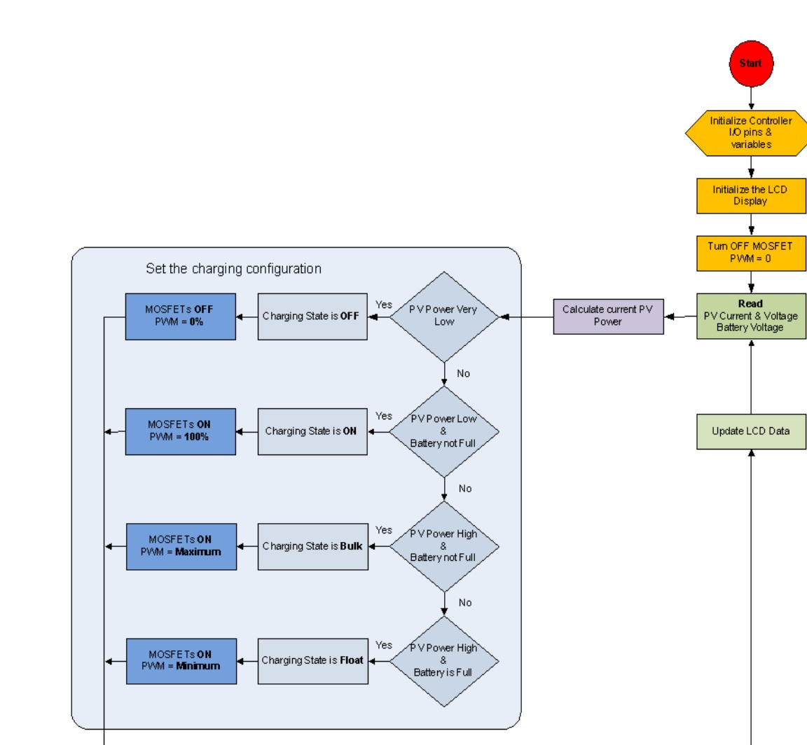 - If the supplied PV power is low and the battery is not fully charged, the charging state is set to ON, the MOSFET driver is enabled, and the PWM rate is set to 100%.